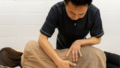 M様の施術では、座位で胸郭出口の硬さを最終確認し、調整していきました。