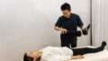 K様の施術は、まず仰向けの状態から始まりました。「両膝曲げてください」という指示のもと、骨盤周辺の筋肉の状態を確認し、必要な調整を行いました。この体勢では、腹部の緊張や内臓反射の有無もチェックされ、「内臓反射はない」と確認されました。